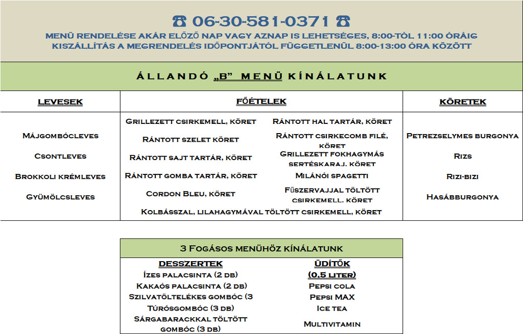 | Gyerek menü 0,2-es üdítővel (rántott csirke, köret, ketchup) | 1.490 Ft |